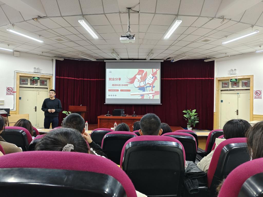 讲座开始,新疆湘润新材料科技有限公司HR孙翊翔结合自身职业成长经历,用生动有趣的言语为同学们带来了“资讯爆炸时代下,把脉行业发展态势”主题分享。他从国家政策导向、行业发展趋势、就业前景、行业选择等方面进行深入分析,为同学们讲述职场攻略,分享最新的行业动态及企业对人才技能的要求,让同学们更清楚的明确未来的奋斗方向。