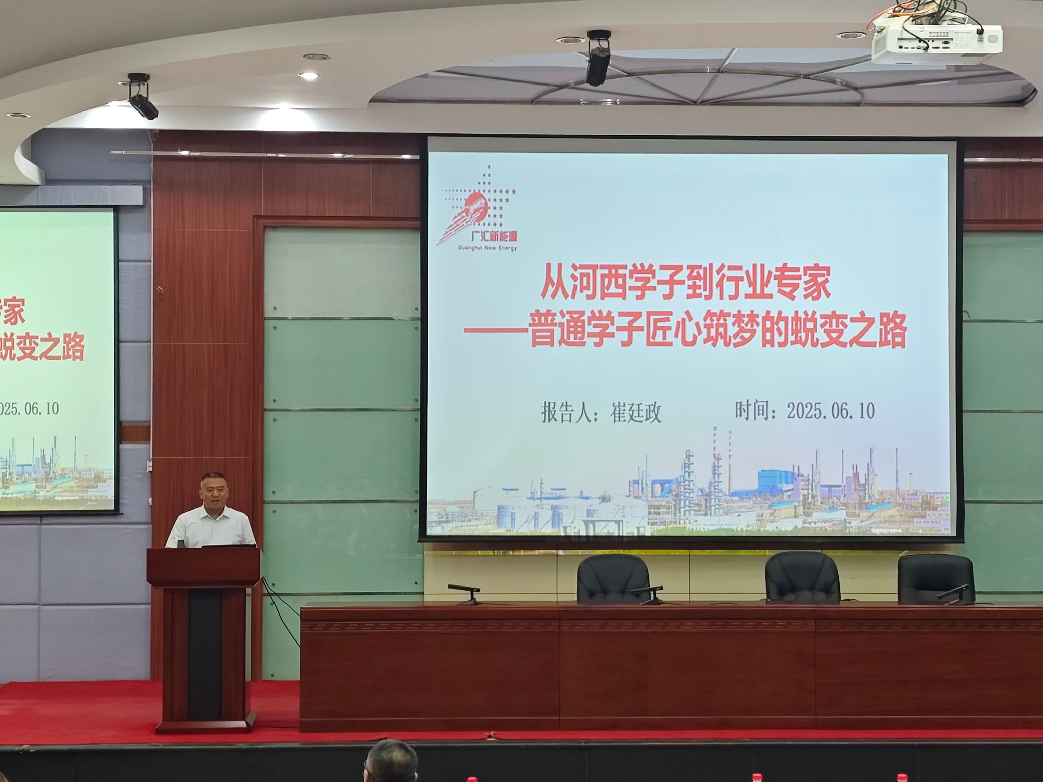 6月10日,公司举办新疆优秀员工励志报告会。2008届化学专业员工、新疆广汇新能源有限公司总工程师崔廷政受邀返校,分享成长经历并参与校企合作深度座谈交流。